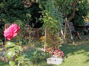 Ferienwohnung Am Elberadweg je komfortní apartmán v Drážďanech s možností grilování a výhledem do zahrady. Nachází se pouhých 4,7 km od zámku Wackerbarth a 7,4 km od veletrhu Messe Dresden. Nabízí jeden pokoj s výhledem na hory, balkon a bezplatné soukromé parkování i Wi-Fi.