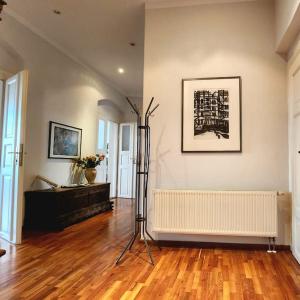 В апартаментах имеется полностью оборудованная кухня с плитой, духовкой, посудомоечной машиной, кофемашиной и принадлежностями для приготовления чая и кофе, кухонная утварь и обеденный стол обеспечивают комфорт гостей. В квартире предусмотрено отопление по всему помещению и паркетное покрытие из натурального дерева. Дополнительно доступны стиральная машина, зона отдыха с диваном, рабочий стол, а также детская кроватка или люлька.